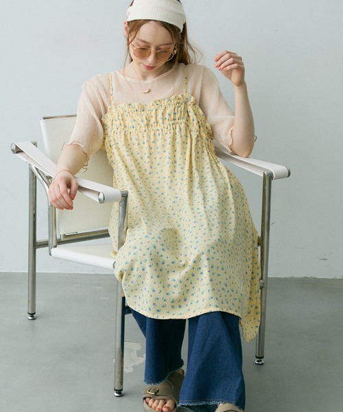 【パッと目を惹く明るめカラーが夏らしいキャミチュニック】・長めのチュニック丈・胸部分のフリルデザインはゴム仕様、緩めのサイズ感でラフな着心地に・細めのショルダーが女性らしく、華奢な印象に・背中部分はさりげないボタンあきデザイン・つるっとした手触りで軽く、落ち感のあるポリエステル素材を使用~スタイリング~ドロワーズパンツとナチュラルにもデニムとカジュアルダウンさせた着こなしも◎キャミやタンクトップとヘルシーな肌見せを楽しむのはもちろん、Tシャツやシアーシャツを合わせて肌の見え加減を調節するのもおすすめです。- - - - - - - - - - - - - - - - - - - - - - - - - - - - - - - - -透け感:なし伸縮性:なし光沢感:なしポケット:なし洗濯: 自宅洗濯可能(ネット使用推奨)- - - - - - - - - - - - - - - - - - - - - - - - - - - - - - - - -※着用、お取り扱いの際は、商品についている品質表示とアテンションタグを必ずご確認下さい。※ご確認ください※商品の特性上、ゴム部分のギャザーに個体差がございます。ギャザーの寄りが少ないなと感じた部分に関しましては、寄りが強い部分から少しずつ伸ばしていただくと多少調節が可能です。不良品ではございませんので予めご了承くださいませ。夏服/小花柄/レイヤード
