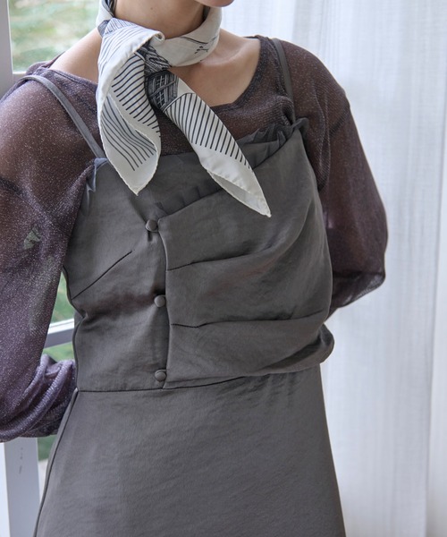【design point】 胸元に入った立体感のあるドレープが印象的なキャミワンピース。 斜めに切り替えられた胸元は、シンプルながらも印象的なディテールに。 デコルテ部分にはチュールフリルをあしらい、甘さをプラスしながらも抜け感のある仕上がりにしています。 スカート部分は落ち感のあるAラインで、動くたびに美しく揺れるシルエットが魅力。 アジャスターが付いているので、お好きな長さに調節可能です。 チャコールグレーの無地1色とトレンドの花柄(ブラック)のアソートでご用意いたしました。 【styling point】 1枚でさらっと着るのはもちろん、インナーにglitter sheer long sleeve tops / グリッターシアーロングスリーブトップス(品番:494547)を合わせたり 同日発売のtulle bustier design sheer shirt / チュールビスチェデザインシアーシャツ(品番:494548)との レイヤードスタイルもおすすめ。 ………………………………… 透け感:なし 裏地:あり 伸縮性:あり(バックゴム使用) ポケット:なし ファスナー:あり ………………………………… 【 ATTENTION 】 ・アテンションタグや洗濯表示を必ずご確認の上、ご使用下さい。 ・ご覧のモニター環境や撮影環境により、実物の商品と多少色味が異なって見える場合がございます。 ・サイトに表示されているカラー名、商品名は実際のお届け商品のタグに記載されているカラー名、商品名と異なる場合がございます。 また表示のサイズ感と実物は若干異なる場合もございますので、予めご了承ください。