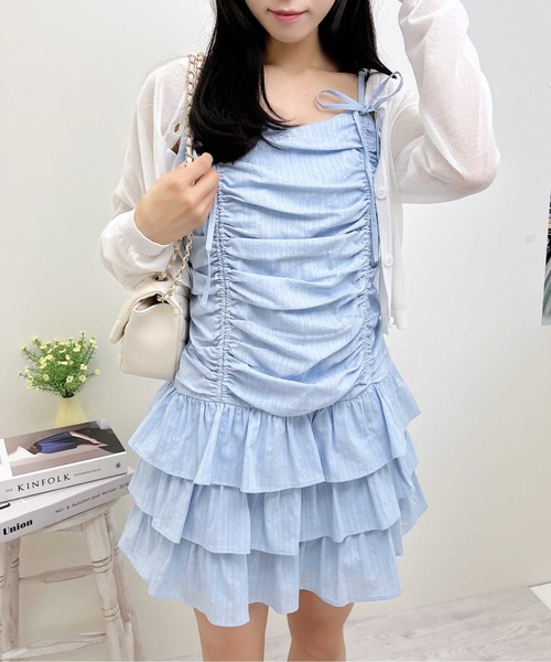 【程よいボリュームのフリルデザインがかわいいキャミワンピース】 ▼Design ドレープ&フリルが存在感たっぷりなミニ丈のワンピース。 華奢なショルダーストラップがデコルテラインをキレイに見せてくれます。 ナチュラルな雰囲気のコットンレースで季節感のある着こなしに。 背中部分にはゴム入りでフィット感良く着られます。 脱ぎ着しやすいサイドジップ付き。 カーディガンやシャツなどを合わせた着こなしもおすすめ。 ▼Styling 厚底スニーカーやキャップなどでカジュアルダウンさせるのがおすすめ。 キャミワンピースは羽織るものを変えるとロングシーズン着用していただけます。 ▼Recommend ・ドロストデザイン ・コットンレース ・ミニワンピース ・レイヤード ・ワンピース ・キャミワンピース ・夏ワンピ ・肩紐調整可 【以下ブルー参考。カラーにより多少の誤差あり】 ・透け感:やや透ける(表地) ・伸縮性:なし ・生地の厚さ:普通 ・裏地:あり