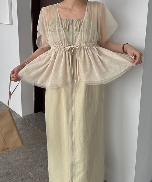 【デザインポイント】・切替下がティアードになったチュールトップス・ウエスト部分は紐でギャザー分量を調節可能に・着丈に前後差をつけてメリハリを【スタイリングポイント】・patchwork back pocket nylon camisole OPと セットアップでご着用いただけます・セットのキャミワンピースとレイヤードした オケージョンスタイルはもちろん、 デニムパンツ合わせでキャミインナーなどの 上に羽織ったカジュアルスタイルもおすすめ・ウエストギャザーは絞るとペプラムシルエットになり よりレディライクな印象に 絞らずにさらっと羽織ったスタイリングも◎透け感 あり伸縮性 あり裏地 なしウエストゴム なしファスナー なしポケット なしアジャスター (ウエスト)紐ありこの製品は非常に柔らかく薄い生地を使用しております。強度な力が加われば縫い目が開いたり生地が破れたりすることがありますのでご注意ください。素材の性質上、引っ掛け、引っ掛かりが起きやすいので、お取り扱いにご注意ください。この製品はデザイン上、裁ち切りの部分があります。着用や洗濯の繰り返しでほつれる場合がありますのでご注意ください。・手洗い・日陰の吊り干し・タンブラー乾燥禁止フリル スリーブ ペプラム チュール トップス