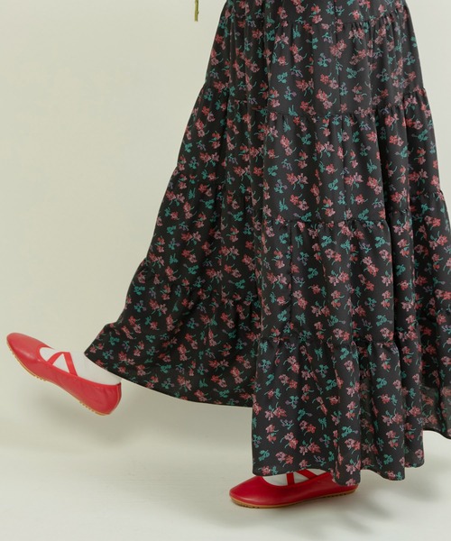 クロスステッチのような花柄がノスタルジックな雰囲気のティアードスカート。1960~1970年代のヨーロッパヴィンテージ資料を基に作成したオリジナルテキスタイルです。花柄をよく見るとクロスステッチ風で、刺繡の持つどこか温かみのある柔らかな雰囲気をプリントで表現し、他にはない特別感を演出しました。素材はジョーゼットを使用することでシャリみがあり、さらりとした肌触りが◎たっぷりのギャザーやティアードでボリュームがありつつも軽やかな印象で、暑い時期にも取り入れやすく、ウエストゴムの仕様でストレスなく気軽に履けるのも嬉しいポイント。内側にはヒモが付いているので微調整も可能です。暑さが長引く端境期には半袖と、秋冬にはスウェットやニットと合わせてシーズンレスで活躍。普段使いはもちろん、キチンとしたシーンにも◎同シリーズでキャミソールワンピース(1101OP002252)もご用意しております。-----------------------透け感:ややあり裏地:なし伸縮性:なし光沢感:なしポケット:あり--------------------【素材の特性・お取り扱いの注意】・取り扱いの注意については取り扱い表示をよくご確認の上、着用をお願い致します。・こちらの製品はデザインの特性上、極度な負荷が加わることにより縫い目から裂ける恐れがあります。洗濯や着脱の際には充分ご注意下さい。・この製品は、素材の特性上汗や雨等でぬれた時、強くこすれた場合等、色落ちし、他の衣料に移染することが有ります。特に白いバッグや白いインナーやボトム等、摩擦によって色移りしますので、コーディネートには十分ご注意ください。クリーニングの際は単独洗いを行い、湿った状態で放置せず、すみやかに処理(脱水・乾燥)するようお願い致します。※撮影画像は、光の当たり具合やモニターの環境により色味が違って見える場合があります。あらかじめご了承ください。※着用の商品はサンプルで撮影しております。お届けする実際の商品と仕様、加工、サイズが若干異なる場合がございます。
