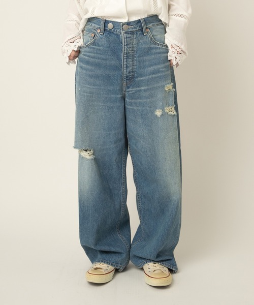 ユーズド風のワイドデニム ■POINT■ 脇のラインをまっすぐにパターンを展開した、すっきりとしたワイドストレート。 太ももや腰の張り付き感がなく程よいゆとりが特徴。 ウエストのタック釦の位置で、履き位置や雰囲気ががらっと変えられます。 通常の位置だと脇がまっすぐのシルエットが強調されるので、ボーイフレンドっぽいシルエットになり、小さい方の位置で留めると体の丸みに沿うので、女性らしいシルエットになります。 ■生地■ 12.5オンスの国産のデニムを使用。ナチュラルなムラ感と程良いハリがありながら履くほどに味わいの出る加工映えする素材です。 ■COLOR■ C/#800・・経年変化を思わせる中古加工を施しました。インディゴの魅力が伝わるように色を落としすぎないことを意識しました。 C/#888・・ベース加工は800と同じ。そこから更にダメージ加工を施しました。大人の女性が履けることをイメージしてダメージ位置や大きさなど、細部までこだわっています。888のみ後ろ裾が1.5cm長いのもポイントです。 ■サイズ■ 通常位置で留めたウエスト:S/77cm M/80cm 小さいほうの位置で留めたウエスト:S/72cm M/75cm 透け感:透けない 伸縮性:なし 裏地:なし ポケット:あり ウエストゴム:なし ---------------------------------------------------------------------- ◆◆お気に入り登録しておすすめ情報をゲットしよう◆◆ 【商品のお気に入り登録】 再入荷、残り1点、セール、タイムセール、クーポンなど、 いち早く受け取ることができます。 【ショップ・ブランドのお気に入り登録】 新商品、予約商品、再入荷、ショップのおすすめトピックスなど、 ショップ・ブランドの最新情報を受け取ることができます。 ---------------------------------------------------------------------- ※商品についている品質表示タグやアテンションタグを必ずご確認の上、着用、またはお取り扱い下さい。 ※画像の商品はサンプルです。実際の商品と仕様、加工、サイズが若干異なる場合がございます。 ※撮影場所により、光の当たり具合で色味が異なって見える場合がございます。商品写真はできる限り実物の色に近づけるようにしておりますが、実際の商品と色味が異なる場合がございます。カラーは商品の掛け画像をご参照下さい。