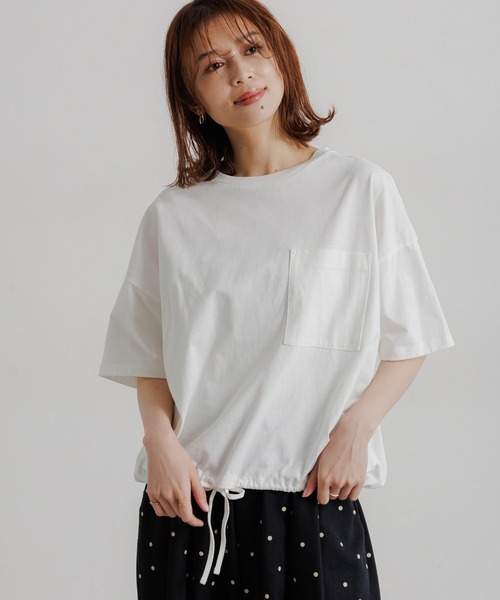 ポケットと裾ドロストディティールがアクセントにレイヤードも楽しめるTシャツーーー【素材】カジュアルな表面感の天竺素材を使用。しっかりとした生地感で、着心地の良さも特徴です。【デザイン】暑くなるこれからの時期に欠かせない、定番アイテムのTシャツ。一見シンプルに見えますが、ポケットと裾ドロストディティールがアクセントに。透け感 :透ける(オフホワイトで計測しています。)伸縮性 :あり生地の厚さ :普通裏地 :なしポケット :ありトップス カットソー ギャザー ドロストーーー【スタイリング】一枚着はもちろん、トレンドの短め丈なのでインナーの裾をチラ見せしたレイヤードコーデもお楽しみいただけます。