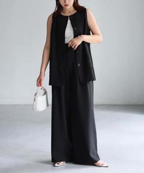 【Riberry ノーカラーベスト×タックワイドパンツセットアップ】 \単体使いでもサマになる!/ 落ち着いた雰囲気とさりげないモード感漂う大人セットアップ♪ ■Styling きちんと感とリラクシーさを両立した、ノーカラーベストとワイドパンツのセットアップが登場しました。 シンプルでミニマルなデザインながら、シルエットと素材感にこだわった一着。 洗練された大人な印象のノーカラーベストは、フロントの大きめポケットが程よいアクセントに。 ワイドパンツはタック入りで立体感のあるシルエットを演出し、動きやすさと脚長効果を兼ね備えた優秀パンツです! セットアップで着ればインナー次第で、通勤やちょっとしたお呼ばれにも対応できるきちんと感。 インナーにシアートップスやカットソーを合わせて抜け感のあるスタイルもおすすめです◎ スニーカーと合わせてカジュアルダウンさせたり、ローファーやパンプスで上品に仕上げたりと、小物で変化をつけることで、オンオフ問わず着まわせる万能アイテムです♪ ■Detail フロントボタンのノーカラーベストは、無駄を削ぎ落としたミニマルなルックスが魅力。 肩まわりはすっきりと仕上げつつ、ヒップまでしっかり隠れる丈感で大人っぽい印象に◎ ボトムスはフロントにタックを効かせたワイドストレートシルエットで、ウエストまわりはすっきりと見せつつ、裾に向かってゆるやかに広がるラインが美脚効果を演出してくれます。 後ろ部分はゴム仕様なので着脱も楽ちん♪ ■Material ポリエステル96%、ポリウレタン4%の混紡素材を使用。 麻のようなさらっとした快適な着心地が魅力です。 シワになりにくく、お手入れも簡単なのも嬉しいポイント。 長時間の着用やアクティブな日にもストレスフリーな素材感で旅行にもおすすめです! ▽生地感 透け感:あり 〇〇〇●〇 なし 生地の厚さ:厚い 〇〇●〇〇 薄い 裏地:なし 伸縮性:なし 『ベスト』→ポケットあり 『パンツ』→横ポケットあり、ファスナーなし ※この素材は性質上、発汗、摩擦等により、ほかの衣料やバッグなどに多少色落ちや色移りする場合がありますので、十分にご注意下さい。 ※商品の梱包には細心の注意を払っていますが、通販の特性上、到着時に畳みシワがついている可能性がございます。予めご了承ください。 ※お肌のデリケートな方は刺激を感じる場合がございます。 ※詳しいお手入れ方法は商品タグをご参照ください。 【Information】 ◆《お気に入り登録》がオススメ◆ ・「商品のお気に入り登録」で再入荷通知や、ラストの通知、セール通知も受け取ることが出来ます。 ・「ブランドのお気に入り登録」で新商品や再入荷など、お得な情報を受け取ることが出来ます ※撮影時のライティング、太陽光、ご覧になっているモニター・PC環境により、実際の商品と色味が異なって見える場合がございます。予めご了承をお願い致します。