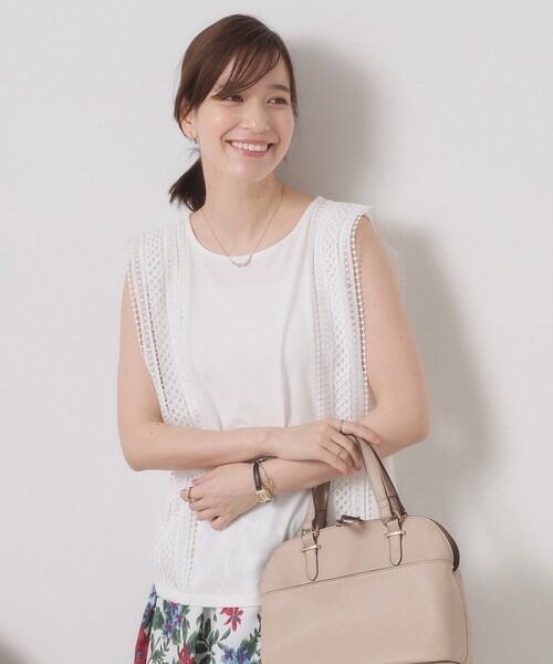 【デザイン】 一枚で着映えするレースデザイントップス。 フェミニンスタイルからカジュアルコーデまで幅広くマッチ。 幾何柄風の甘すぎないレース柄を使用した、大人も着やすいレーストップス。 カジュアルにもフェミニンにも着まわせる優秀アイテム。 後ろ身頃にもレースをあしらっているのでバックスタイルも華やかにきまります。 裾までレースがあるので腰周りも間延びせず、ボトムにINせず着やすデザイン。 【素材】 フラット表面感の天竺ジャージー素材。 ※照明の関係により、実際よりも色味が違って見える場合があります。また、パソコン・スマートフォンなどの環境により、若干製品と画像のカラーが異なる場合もございます。 ---------------------------------------- ★お気に入り登録がおすすめ★ ▽気になる商品はハートマークをクリック! ・再入荷やセールの通知をお知らせ ・お気に入り一覧からいつでもチェック ▽ブランドのお気に入り登録も! ・新商品やお得な情報をいち早くお知らせ ---------------------------------------- モデル情報:身長166cm B80 W59 H85 着用サイズ:00(フリーサイズ) 店舗へのお問い合わせ商品番号:P93-12544 ●製品寸法: 00(フリーサイズ):着丈58cm B92cm 裄丈19cm 備考: