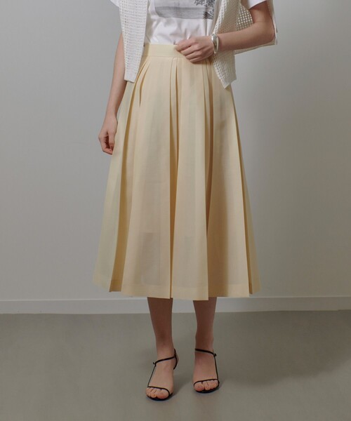 【allureville 2025 autumn&winter】 ハリ感のあるシアー素材を使用したプリーツスカート。 裾広がりのパーツを重ねたようなプリーツで、透け感のある素材を重ねることで奥行きとコントラストを出したトレンド感のある1着です。 表地と裏地に差をつけることで足元が軽やかな雰囲気に仕上げた夏の装いにぴったりなシアースカート。 膝の隠れる上品な丈感なのでオンオフ問わずご着用頂けます。 ボリューム感のあるシルエットなのでトップスにはコンパクトなものを合わせるレディライクな着こなしがおすすめです。 ネイビーは透け感が軽減されていて、逆にイエローは透け感が強いです。 裏地はついていますが、念のため下着の色を合わせて頂くか、お手持ちのペチコートを合わせて頂くのがおすすめです。 【スタッフコメント】 シルエットのきれいなプリーツスカート。 幅の異なるプリーツをMIXしたデザイン性のある一枚です。 少し張りのある生地感で綺麗なシルエットをキープしてくれます。 とても軽くノンストレスな着心地です。 綺麗に広がる裾に対し、すっきりとしたウエスト部分が華奢見え効果あり。 コンパクトな丈のアイテムを合わせたりトップスをインして着るとよりスタイルアップ見えします。 フレアシルエットが大き過ぎず落ち感もあり甘過ぎない印象です。 イエローは透け感があり、サックスとネイビーは透け感はほとんど気になりませんでした。 ご自宅でお手入れ可能です。 ※照明の関係により、実際よりも色味が違って見える場合がございます。 またパソコン・スマートフォンなどの環境により、製品と画像のカラーが異なる場合もございます。 予めご了承ください。