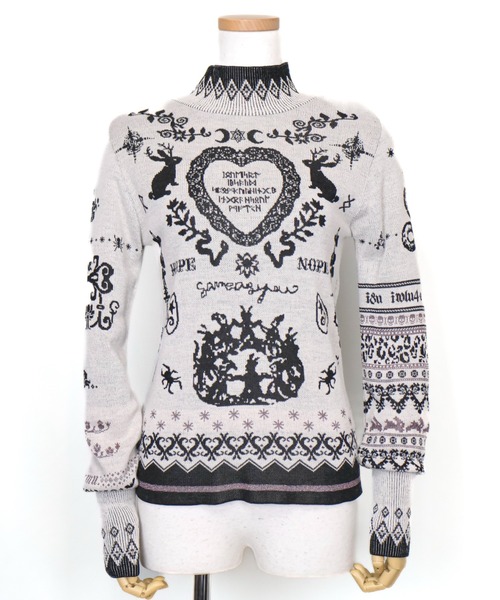 rurumu: rurumu:冬の定番のハイネックのニットトップスが今季も再登場。サイズmはediumとlargeの2サイズ展開で、ジェンダーを問わず着用可能。 前後どちらでも着用できる2WAY仕様で、気分やスタイリングに合わせたアレンジが楽しめます。袖口は親指を出して手を覆うデザインで、手の甲までタトゥーが彫られているイメージを表現しています。 "Floaters"が授業中に落書きしたようなモチーフやジャッカロープ、過去シーズンで使用していたテキスタイルなどをジャカードで表現した、ハイネックのニットトップス。また、蛇や魔女、折り紙占いといった神秘的で象徴的なモチーフを随所に取り入れ、今季らしい柄を落とし込んだ一着に仕上がっています。 胸元にはルーン文字を用いたフレーズが編み込まれています: ・LOVE IS FRUITFUL(愛は実る) ᛁᛟᚢᛖᛋᚱᛏ ・WE WILL BE SAVED(私達は救われる) ᛁᛒᛋᚨᚢᛞ ・A SPELL TO MAKE EVERYTHING BETTER (全てを良くするおまじない) ᛋᛈᛟᛗᚲᚢᚣᚺᛁᚾᚷᛒ ・INTEGRATE THE SOUL(魂を統合する) ᛁᚾᚷᚱᚨᚺᛋᛟᚢᛚ ・I AM WITCH(私は魔女です) ᛗᚹᛏᚲᚺ これらのフレーズは、霊性や自己肯定、癒しへの願いを内包しており、まるで身にまと“おうまじない”のような力を感じさせます。 ― ルーン文字について― ルーン文字とは古代北欧で使われていたアルファベットで、語源"は秘密·神秘·謎"を表すゴート語で、もともと呪術的、宗教的な文字であるとされる。その為ルーン文字が記された物は呪術的な属性を持ち、日常的または占いや儀式などにも使用されてい ※納期について 表示に出ている納期ですが余裕をもった納期設定となっております。 10月下旬~納品次第順次発送となります。 rurumu:・・・ 2009年よりデザイナーの東佳苗が一点物のハンドメイドニットを中心とした縷縷夢兎(るるむう)をスタート。 アーティストやアイドルの衣装を手がけ、映画製作も行う。 お客様に確実に商品を届けたい考えから、展示受注会でオーダーを受け、工場で量産するブランドrurumu:を2019SSコレクションからスタート。 【お買いものをお楽しみいただく為に!】 ▼商品のお気に入り登録 完売カラーの再入荷通知や、ラスト1点の通知、セールの通知も受け取ることができます。 ▼ブランドのお気に入り登録 新商品や再入荷など、いち早くブランドのお得な情報を受け取ることができます。