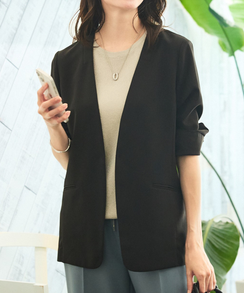 NEW!【エニデイカセット】に夏専用が登場! 【Design】 mavie人気キレイ目シリーズ【エニデイカセット】に夏の強い味方となる着心地涼やかなサマーシリーズが仲間入り!セットインのショルダーとフロントホックできちんと見えはそのままに、女性らしい柔らかさとエアリーな着心地に。どんなに暑い日でもジャケットを脱げないシーンにも活躍してくれます。袖口はお好みで折り返しできる仕様になっています。 【Fabric】 薄手のジョーゼット生地を使用。ご自宅で手洗い出来るのも夏に嬉しいポイントです。 【Styling】 キレイ目アイテムながら、夏のキャミワンピなどの羽織としてもおすすめ。働く女性に、日除けや冷房対策の”置きジャケ”にも◎お買い得な同素材パンツとのセットアップもご用意していますので、そちらもぜひチェックしてください! 【WEB限定!お買い得な2点セットはこちら▼】 “【2点セットアップ/エニデイカセット・サマー】ジョーゼット ジャケット&パンツセット” 検索➡72509990136 “【2点セットアップ/エニデイカセット・サマー】ジョーゼット ブラウス&パンツセット” 検索➡72509990135 ********************** 透け感:なし 裏地:なし 伸縮性:ややあり 光沢感:なし 生地の厚さ:やや薄手 **********************