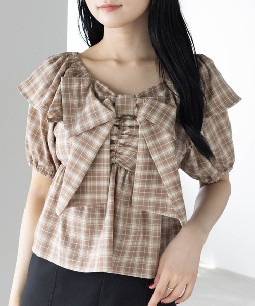 大きなリボンがかわいい!ビッグリボンチェック柄2way半袖ブラウス【デザイン】存在感のある大きなリボンが映える主役級ブラウス!ふんわりしたパフスリーブとギャザー入りのディティールが女性らしい柔らかさを演出します。そのままで着ても、オフショルダーでも楽しめる2way仕様で気分に合わせて着こなしが可能です◎【素材感】着心地の軽いポリエステル素材伸縮性:あり/ 透け感: なし/ 裏地:なし 手洗いによる洗濯可 / ドライ・ウェットクリーニング可【コーディネート】デニムに合わせてカジュアルダウンしたりスカートに合わせてガーリーに仕上げたり幅広いスタイリングが楽しめます♪【※お取り扱い上のご注意】1:モニター環境等により実際の商品と多少色味が異なって表示される場合がございます。予めご了承下さい。2:屋外で撮影された商品は、天候により多少実際のカラーと異なる場合があります。商品のカラーはトルソー(マネキン)の商品画像をご参照ください。3:濃い色の商品は、お洗濯や摩擦等による移染にご注意ください。4:末永くご愛用頂く為に、アテンションタグ・洗濯ネームを必ずご確認の上、着用又はお取り扱い下さい。5:生産時期により、色、サイズ、デザイン、素材の質感が多少が異なる場合がございます。あらかじめ御了承下さいませ。