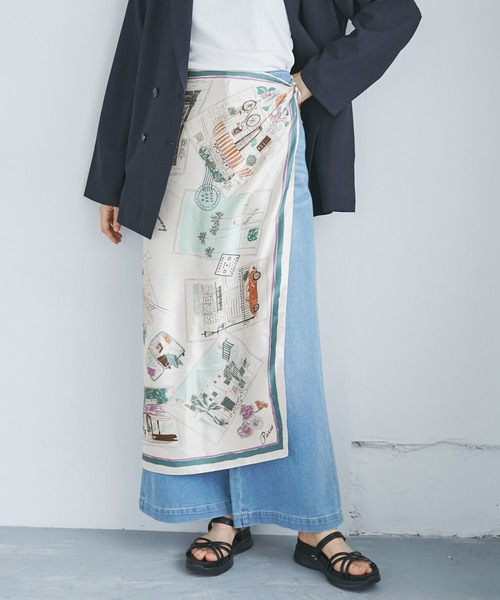 旅気分を纏う、華やぎスカーフ【素材感】・環境に配慮したサスティナブル素材のポリエステルを使用。【デザイン・シルエット】・リゾート地や普段の街中、日々の思い出を写真に収めてそれを一枚のスカーフにした旅の思い出スカーフ。・色鮮やかなお花や風景、自分がパッキングした荷物、パスポートに押されたスタンプ。など思い出一つ一つを思い浮かべられるようなオリジナル柄がポイント。【カラー】・ブラウン、ダークグリーンの2色展開。【スタイリングポイント】・首元にひと巻きしてTシャツ×デニムの定番コーデを格上げ。・ヘアに結んで、夏らしい抜け感と華やかさをプラス。・バッグのハンドルに巻いて、さりげないトレンド感を演出。※撮影時の光、お使いのモニター環境によって色の見え方が違う場合がございます。※前回好評だったスカーフ(品番:GIN25000)の柄はそのまま、カラーとサイズを変更。
