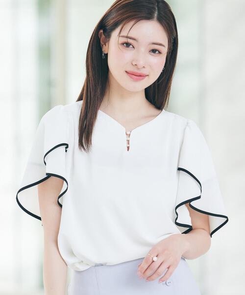 毎年定番のフレアブラウスが今年も登場!~POINT~二の腕カバーができる人気のチューリップデザインのお袖が可愛いです◎胸元のパール調デザインをはしごにあしらった華やかなデザインですさらっとした着心地で着やすく、夏の通勤にもおすすめの一枚です【素材・機能】さらっとしたきれいな表面感に、程よい落ち感が特徴的な布帛素材を使用オフ、グレーのみ配色デザインを採用※ハンドウォッシャブル機能付き※照明の関係により、実際よりも色味が違って見える場合があります。また、パソコン・スマートフォンなどの環境により、若干製品と画像のカラーが異なる場合もございます。【スタッフコメント】・saori(153 )人気の配色デザインで、一枚で着映えるきれいめブラウスです◎Vあきなので顔周りもスッキリ見えし、女性らしい印象を与えてくれます◎通勤~おでかけまでおすすめの一枚です!【25SS NEW ARRIVAL】【25SS NEW COLLECTION】モデル情報:身長163cm B81 W56 H82 着用サイズ:38(M)店舗へのお問い合わせ商品番号:508-82056●製品寸法:36(S):着丈55cm B95cm 肩幅32cm 袖丈26 38(M):着丈56cm B98cm 肩幅33cm 袖丈26cm40(L):着丈57cm B101cm 肩幅34cm 袖丈27cm42(LL):着丈58cm B104cm 肩幅35cm 袖丈27cm備考: