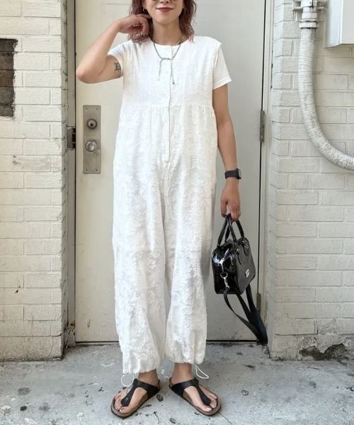 インド綿の繊細なジャガード生地を使用したスリーブレスコンビネゾン ・上品な印象を演出する繊細な織り柄のインド綿ジャガード生地を使用 ・ウエスト上の切り替えでスタイルアップ効果も◎ ・風通しの良い綿素材で春夏は一枚でさらっと快適に着用可能 ・ロンTや薄手ニットとのレイヤードで秋冬にも対応し、ロングシーズン活躍 ・ホワイト、ブラックの2色展開 この製品はインド製の素材を使用しています。 織りむら・染色むら・ネップ(織り玉)がありますが生地特有の風合いで、キズではありませんのでご了承下さい。 雨や汗などで湿った場合や強い摩擦により、他の衣類等に色移りすることがありますのでご注意下さい。 特に白物(淡色)との着用はお避け下さい。 濡れた時は他の衣類と重ねないで下さい。 デリケートな素材ですのでお取り扱いは丁寧にお願いします。 アクセサリーや時計などへの引っかけにご注意下さい。 又、強い日光(照明)を長時間受けますと、変色の恐れがありますので、着用及び保管の際にはご注意下さい。 商品特性 透け感 : なし 伸縮性 : なし 生地の厚さ : 普通 裏地 : あり スタッフレビュー 細やかなジャガード生地が軽やかで上品な印象を与えてくれます。 ウエスト位置が高めなので脚長効果もあり、着るだけでバランスの良いシルエットに。 季節ごとにインナーを変えることで、着回しの幅が広がるおすすめのアイテムです。 お気に入り登録 ・商品のお気に入り登録 再入荷・残り1点・セールの通知を受け取ることができます。 ・ブランドのお気に入り登録 新商品・再入荷/・ショップおすすめトピックスなど、ブランドの情報を受け取ることができます。 取扱注意事項 モデルの着用画像の場合、光の当たり具合により、実際の色味と異なって見えることがございます。 色味は、商品生地の画像をご参照ください。