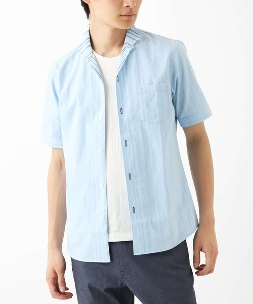 【一枚着でもサマになる半袖シャツ】 【日本製生地を使用】 <素材> ・コットン/ポリエステル糸を混紡したドライな風合いのシャツ生地 ・綾目組織で微光沢があり綺麗なめな印象です。 ・表面は無地ライクな表情でありながら裏面ははっきりしたストライプ柄でメリハリを付けました。 <デザイン、機能> ・カジュアルみえする7分袖丈シャツ。 ・カラーによってカジュアルから大人めなスタイルにまで使えるカラー展開。 ・ライトな素材感なので春から初夏まで、長い期間着用が可能。 ・程良くウエストシェイプしたスマートシルエット。 ・カフス裏面にはストライプ柄を配しロールアップ時のアクセントにしました。 <コーディネート> 襟からチラッと見えるストライプ柄がこなれ感を演出します。 またロールアップすると袖部分にもストライプ柄が現れ、コーデのアクセントに。 3色とも今トレンドのデニムとの相性が良く、ぜひ合わせていただきたいです。 <生地感> ・透け感⇒白以外無し ・生地厚さ⇒ふつう ・ストレッチ感⇒ややあり