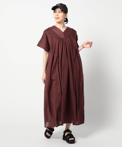 コットンボイル カフタン風ワンピース 直線裁ちに近い、体を締め付けないシンプルでゆったりとしたカフタン風ワンピースです。 民族衣装が元になっているカフタンは日差し除け効果のある長い着丈や風通しの良い筒型シルエットが特徴で、とても涼しく着て頂けます。 襟元のピンタックはインド生産ならではの繊細さです。 ■point 柔らかく肌触りの良い風合いと発色の良さが魅力のインド綿コットンボイルを使用しています。 通気性と吸湿性に優れ、暑い夏でもさらりと快適に過ごせます。 綿100%の裏地付きなので、透け感を気にせず1枚で着用出来ます。 ■detail *インド綿使用 *サイドにシームポケットあり *約125cm丈 ■fabric …………………… 透け感:なし 裏地:あり 伸縮性:なし 光沢感:なし 生地の厚さ:薄い 洗濯方法:手洗い可 …………………… ※詳しいお手入れ方法は商品タグをご参照ください ■coordinate *小物次第で大人っぽくもカジュアルにも使えます。 *下に薄手のプリーツパンツなどをはいて、柄を取り入れても素敵です。