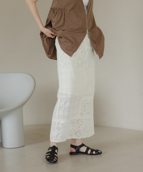 ■素材■ インドで生産された、柄が異なる4種類のレース素材を使用しています。各レースには花や草の柄が施されており、 インドらしい雰囲気を感じられるデザインです。製品洗いを施しており、素材をソフトに仕上げています。 ■デザイン■ 今年らしいコットンレースのパッチワークが可愛いタイトスカート。柄が異なるレースを贅沢に4種類使用し裾には透け感が多いレースを配置して 足元に抜け感がでるように仕上げました。ウエストはオールゴム仕様でぺチスカート付きなので一枚ではもちろん、レイヤードスタイルも楽しむことができます。 ■スタイリング■ フレアパンツやデニムなどとのレイヤードスタイルがおすすめ。ボトムとレイヤードするとレースの柄が際立って可愛いです。 トップスはTシャツやシャツなどカジュアルなアイテムとの合わせが◎