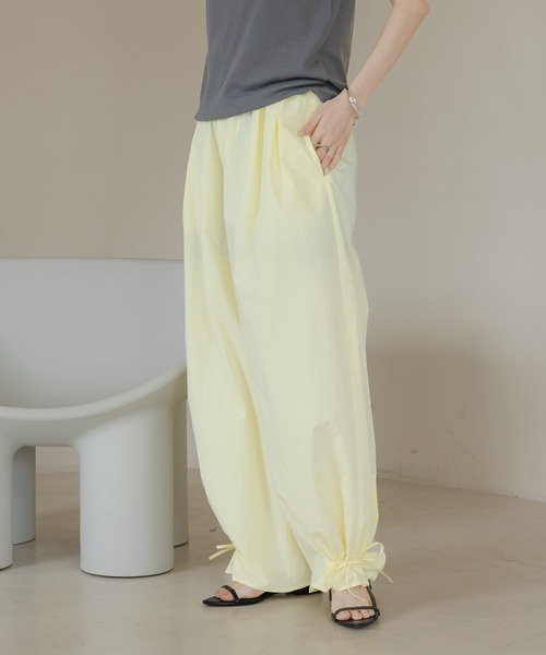 ■素材■ 生地を収縮させる事で凹凸感をだしたコットンポリエステルの加工生地。 シャリ感のある手触りと、洗いざらしたようなヴィンテージ感があります。 素材自体が軽いながらも張り感がでるため、シルエットが美しく表現されます。 ■デザイン■ 裾の半分に紐が通っていてぎゅっと絞ってもゆるい状態でも、お好みのバランスで着用できます。 紐を結んだときにリボン結びにすると可愛いポイントになります。 ウエストは後ろゴム仕様になっていてフロントにタックとギャザーを入れ立体感が出るように仕上げました。 ■スタイリング■ シャツやTシャツなどカジュアルなトップスとの合わせがおすすめです。 インスタイルやショート丈のトップスとの相性も〇