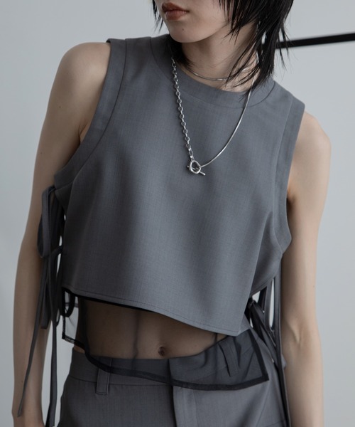 - 2025 VACANCY SUMMER COLLECTION - スタイリングを格上げするノースリーブブラウス。 ◆FABRIC レイヤードにも1枚着にも映える大人モードなタンクブラウスです。 サラッとした生地を使用し、落ち感のいいシルエットに。 甘くなりがちなシアーアイテムに上品さをプラスしました。 ※シアー配色ハーフスラックスパンツ/SETUP (VCTNY252002)同生地を使用。 セットアップとして着用可能です。 カジュアルすぎないミニマルなラウンドネックで レイヤードしたチュールが程よい透け感でコーディネートに抜け感をプラス◎ サイドは身幅調整可能のリボン仕様に。 ゆったりとしているサイズ感なのでベストとしてもオススメです。 様々な着こなしでロングシーズン楽しめる1枚です。 ◆STYLE セットアップはもちろん、 シンプルなデニムや柄スラックス合わせもオススメです。 テーパードパンツやタイトスカートに合わせてオフィスカジュアルコーデにも◎ セットアップにするとワンピース見えし、 オケージョンスタイルも華やかにしてくれるアイテムです。 ・・・・・・・・・・・・・・・・・・・・ 透け感:シアー部分あり 裏地:なし 伸縮性:なし 光沢感:なし 生地の厚さ:普通 ・・・・・・・・・・・・・・・・・・・・ 【お買い物をお楽しみいただく為に】 ▼お気に入り登録をオススメ致します▼ ♡をクリックして下さい。 ・《商品のお気に入り登録》で再入荷通知や、ラスト1点の通知、セールの際の通知も受け取ることができます。 ・《ブランドのお気に入り登録》で新作商品や再入荷など、お得な情報を受け取ることができます! 【ATTENTION】 ※画像の商品はサンプルです。 実際の商品と色味、仕様、加工、サイズ、素材等が若干異なる場合がございます。 ※撮影場所やお使いのモニター環境により若干お色味が異なる場合がございます。 ※製品によっては染料の特性上、湿った状態や汗をかいた状態での長時間の放置、または摩擦により、他のものへ色移りする恐れがありますので、着用時にはご注意下さい。 ※お洗濯については商品の洗濯タグ表記をご確認ください。 ※風通しがよく、湿気の少ない日の当たらない場所で保管して下さい。 ※また製品加工上、お手元に届く際に匂いが生じる場合がありますが、 ご使用を続けていく事により匂いは軽減されます。