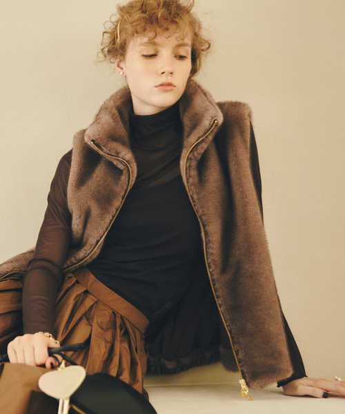 【2025AW】 La Totalite さっと羽織るだけで旬顔になれるスタイリングの幅が広がるファージレ。 ずっと触れていたくなるような手触りの良い質感のエコファー素材は上品な艶感と滑らかなタッチが特長です。 スタンドカラーなのでラフな雰囲気を残しつつ、ゴールドのジップがアクセントになり女性らしさを格上げ。 肌寒い季節にはジャケットのインナーとしても楽しんでいただきたい逸品です。 ********************** 透け感:なし 裏地:あり 伸縮性:なし 光沢感:なし 生地の厚さ:普通 ********************** 【スタッフ着用コメント】 《スタッフ名:mizuki》 身長:160cm/体型:普通/普段サイズ:S~M/着用サイズ:フリー サイズ感:コンパクトなサイズ感で着丈は腰にかかるほど。 素材感:素肌に触れても全くチクチクしない、滑らかな質感。 着心地:コンパクトですが窮屈さはなく、軽い着心地です。裏地付きで着脱もしやすいです。 ********************** ※取り扱いについては、商品についている品質表示でご確認ください。 ※照明の関係により、実際よりも色味が違って見える場合があります。 またパソコン・スマートフォンなどの環境により、若干製品と画像のカラーが異なる場合もございます。 ※商品の色味は、商品アップ画像をご参照ください。 着用モデル身長:164cm 着用サイズ:フリー 詳細モデル身長:162cm 着用サイズ:フリー 本体:手洗い可能