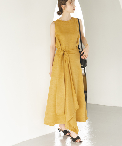 ◆昨年大好評のワンピースが新色を加えて再入荷決定! ※商品番号24040240706020の追加商品です。 ※若干の仕様変更がある場合がございます。 ※レビュー、SNAPには現在お取り扱いのないカラーも含まれます。予めご了承ください。 色ムラのあるスラブ調のマテリアルを採用した、夏の日差しに似合う清涼感たっぷりのワンピース。 ボトム部分は巻きスカートのデザインで、ウエストで生地を結ぶ仕様。 取り外しができミニワンピとしても着用可能で、1枚で2つの着方を楽しめるギミックを効かせたスペシャルなアイテムです。 三角のマチで長さに強弱が出るように工夫されたヘムラインは、風を受けるたびドラマティックに揺らめき女性らしさも存分にアピール。 フリンジの裾が演出する、アーバンリゾートな雰囲気も素敵。 今年は大好評のブラウンD、ベージュに加え、1枚で映えるマスタードを新色に加えて登場です! ********************** 透け感:なし 裏地:あり 伸縮性:なし 光沢感:なし 生地の厚さ:普通 ********************** 【スタッフ着用コメント】 年齢20代/身長:155cm/体型:やや細身/普段サイズ: 34~36 /着用サイズ:36 サイズ感:上見ごろはややコンパクトなサイジング。 スカート部分はフレアシルエットなので締め付けなく着用できました。 素材感: リネン調の涼し気で表情感のある風合い。 着心地: さらりとしていて、7月の気温の高い時期にも着やすそうです。 ミニスカートにもアレンジができ、イメージチェンジして着られるのが嬉しい◎ ********************** ※取り扱いについては、商品についている品質表示でご確認ください。 ※こちらの商品は、NOBLEでの取り扱いになります。 直接店舗へお問い合わせの際はNOBLE店舗へお願い致します。 ※照明の関係により、実際よりも色味が違って見える場合があります。 またパソコン・スマートフォンなどの環境により、若干製品と画像のカラーが異なる場合もございます。 ※商品の色味は、商品アップ画像をご参照ください。 ブラウンD着用スタッフ身長:160cm 着用サイズ:36 ベージュ着用スタッフ身長:155cm 着用サイズ:38 マスタード着用スタッフ身長:164cm 着用サイズ:38 モデルサイズ:身長:162cm 着用サイズ:38 本体:手洗い可能, スカート:手洗い可能