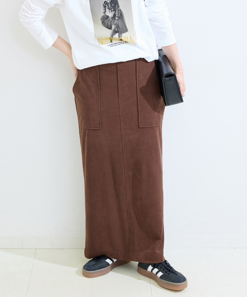 上品な風合いが魅力のポリエステルスエード素材を使用したIラインスカート。 ほどよい肉感で身体のラインを拾わずに、すっきりとした綺麗なシルエットでお作りしたスカートです。トレンド感のある深めの赤みブラウンカラーで、シンプルながらもコーディネートにこなれた印象をプラスします。ウエストはサイドコンシールファスナーで着脱がしやすく、後ろはゴムギャザー仕様で程よいフィット感もあり、トップスインスタイルもきれいに決まります。手洗い可能でご自宅でのイージーケアができるのも嬉しいポイントです! ********************** 透け感:なし 裏地:ヒップ部分まであり 伸縮性:ややあり 光沢感:なし 生地の厚さ:普通 ********************** 【スタッフ着用コメント】 《スタッフ staff.Y》 身長:160cm/普段サイズ:M-L/着用サイズ:フリー サイズ感:程よくすっきりしたサイズ感。 素材感:スエード調の素材。 着心地:やや伸縮性があり動きやすいです。 ※あくまで個人の感想です。 ********************** ※取り扱いについては、商品についている品質表示でご確認ください。 ・水洗いで多少縮みます。 ・着用中の摩擦や、汗、水濡れにご注意ください。濃色品は、色落ちや他のものへ色移りすることがあります。 ※こちらの商品は、B.C STOCKでの取り扱いになります。 直接店舗へお問い合わせの際はB.C STOCK店舗へお願い致します。 ※照明の関係により、実際よりも色味が違って見える場合があります。またパソコン・スマートフォンなどの環境により、若干製品と画像のカラーが異なる場合もございます。 ※商品の色味は、商品アップ画像をご参照ください。 ブラウン着用スタッフ:163cm 着用サイズ:フリー 詳細着用モデル:163cm 着用サイズ:フリー 本体:手洗い可能