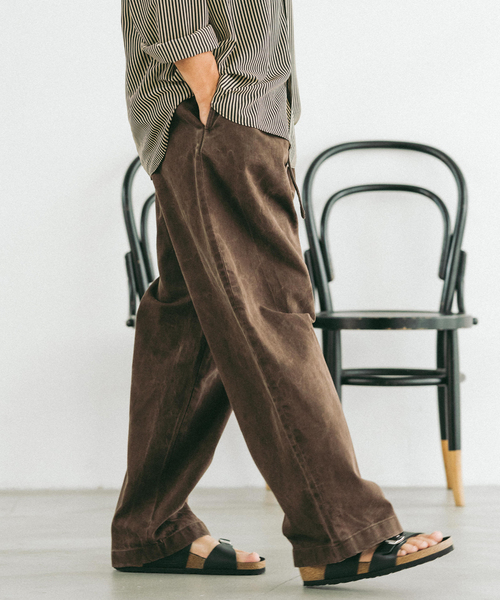 ・デニムライクな風合いのコットンツイル素材を使用し、製品洗いによる自然な当たり感が特徴・古着のような表情と柔らかな質感で、今のトレンドを感じさせる1本・ショート丈トップスとも好相性なバランスの取れたデザイン・ITALIAN ARMYのベルテッドトラウザーをベースに、タック分量やベルト幅を現代的にアレンジ・深めのタックが前身頃にボリュームと立体感を生み、着用時に迫力のあるシルエットを演出・脇線にカーブを入れることで、丸みのある柔らかい印象に・ヒップ周りはややすっきりと設計されており、ワイドながらも品のある仕上がり【ご注意】※商品の色味につきまして、お客様のお使いのPCのモニター環境により実際のカラーと画像の色味が違って見える場合が御座います。予めご了承の上、ご注文下さい。※店頭・外での撮影画像は光の加減で、実際の商品より明るく見える場合が御座います。商品の色味は生地のアップ画像をご参照ください。本体:手洗い可能