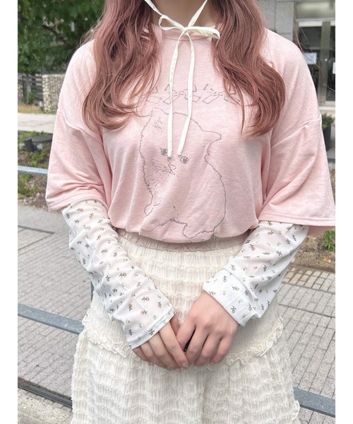 ■デザイン まるでレイヤードしているような袖のドッキングがアイキャッチーなロンT。 シアーの花柄トップスを重ねたようなディティールがコーデにちょっとした遊び心を添えてくれます。 とろんっと落ち感のある生地は、肌触りも優しくて着心地も◎ ねこちゃんとリボンのグラフィックはモノトーンで甘さは控えめに。 ■サイズ ヒップまで隠れる丈感です。 ゆるっとシルエットでも生地に落ち感があるのですっきり見えるのもうれしいポイントです。 ■スタイリング フレアパンツなどを合わせてらくちんに可愛らしく。 【商品情報】 透け感:なし 裏地:なし 伸縮性:あり 光沢感:なし 生地の厚さ:薄手 【商品のお気に入り登録】 ♡をクリック! 完売カラーの再入荷や、ラスト1点の通知、 セールの際の通知も受け取ることができます。 【ブランドのお気に入り登録】 新商品や再入荷など、 merryの情報をいち早くお知らせします! ぜひご登録ください♡