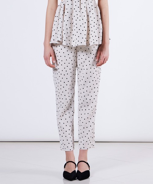 凹凸のあるジャガード素材に立体的なドットプリントを施した、表情豊かなテーパードパンツ。脚のラインをすっきりと見せてくれるテーパードシルエットと、軽やかなアンクル丈が好バランスな一着です。同素材のキャミソールと合わせれば、大人カワイイセットアップコーデが完成。フリル部分を活かせば、ペプラムパンツのような着こなしも楽しめます。※商品画像はサンプルのため、デザイン、素材(混率等)、色味やサイズ等の仕様に変更がある場合がございますので、予めご了承ください。【お買い物を楽しみいただくためには】◆商品お気に入り登録完売カラーの再入荷通知や、ラスト1点通知、セールの通知など受け取ることができます。◆ブランドお気に入り登録新商品や再入荷など、いち早くブランドのお得な情報を受け取ることができます。