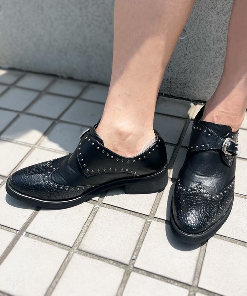 ◆クラシカルにしてエッジィ。唯一無二の存在感を放つメダリオンシューズ。【特長】・つま先とヒールにはクロコ調の切り替え×メダリオンデザインでクラシカルな風格。・アッパーには小ぶりなスタッズをあしらい、パンクなムードをプラス。・サイドのバックルもアクセントに。脱ぎ履きしやすさも魅力。・艶感のあるブラックレザーで、コーディネートに高級感を添えてくれる1足。【コーディネート】・ワイドスラックスと合わせて、都会的なドレススタイルに。・デニムやモード系パンツと合わせて、足元に重厚感をプラス。・シンプルなトップスと合わせることで、このシューズが主役になるバランスに。・スーツスタイルにも外しとして◎。幅広いシーンで活躍します。■商品をお気に入り登録する■お気に入り登録で、再入荷通知やセール情報をいち早くキャッチできます!■ブランドをお気に入り登録する■新作や再入荷情報をすぐに受け取れます。ぜひ登録を!