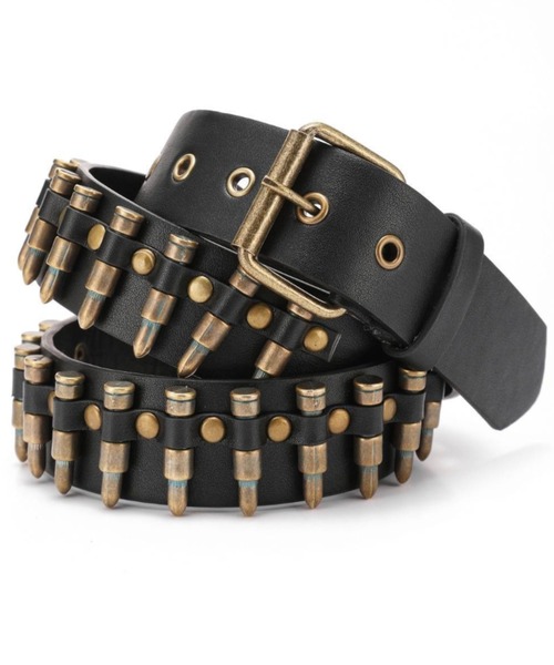 【rovtski select item】弾丸の装飾をあしらった、インパクト抜群のベルト【コーディネート】韓国系、Y2K、古着、ロック、ストリートなど合わせ方でスタイリングも無限大。ベルトがアクセントになるのでTシャツやトレーナーなどシンプルな洋服にもおすすめ。カジュアルなデニムやカーゴパンツ、スラックスなど様々なボトムに合わせられます。タックインコーデに持っておくと良い一本です。