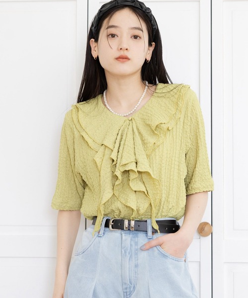 顔回りを華やかに見せる、トレンドのフリルブラウス!■おすすめの着こなし☆パンツスタイルなら・・・きれいめなスラックスと合わせる、大人っぽいスタイリングがおすすめです。サロペットやオールインワンのインナーとして着る、女性らしいスタイリングも◎☆スカートスタイルなら・・・タイトなIラインスカートなどと合わせた、クリーンなスタイルが◎甘めな印象のフリルデザインなので、ボトムスはシンプルなデザインにするのがおすすめです。ーーー■ポイント女性らしい甘めなフリルブラウスが登場。フロント部分にふんだんにあしらわれたフリルが目を惹く一着です。前開け可能なので、羽織りとして着ていただくのも◎程よくコンパクトなシルエットなので、着るだけで華奢見えするのも嬉しいポイントです。柔らかく、肌触りも良いので着心地抜群なブラウスです。■素材耐久性に優れ、シワになりづらいポリエステルとポリウレタンの混紡素材を使用。肌触りの良い生地感なので、ロングシーズン着ていただけるアイテムです。