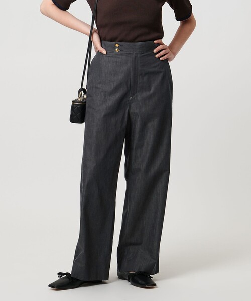 ゴールドカラーのボタンがアクセント。大人のきれいめデニムライクワイドパンツ■デザイン綺麗なシルエットのスラックス型でお作りしたデニムライクのワイドパンツ。定番でありながらも、今シーズンのトレンドとして取り入れたい一本です。上品な風合いの素材感やメタルボタンがアクセントとなり、品のあるカジュアルスタイルを演出してくれます。■素材毛羽の少ない糸を使用したクリアな表情のライトオンスツイル素材。高密度でありながら、しなやかな柔らかさを併せ持った風合いが特徴です。■コーディネート甘めのブラウスとのミックススタイルから、シンプルなカットソーやレギュラーシャツとのベーシックスタイルまで、トップスを選ばず活躍。ボタンを見せたトップスインの着こなしが映えるアイテムです。・素材は異なりますが、同デザインの色違いのご用意もございます。対象品番:15141625469============================裏地:なし透け感:なし伸縮:なし光沢感:なしケア方法:手洗い可============================【注意事項】※商品に「取り扱い上の注意書き」、「洗濯表示」がございます場合は、使用前に必ずご確認ください。※商品画像は、光の当たり具合やパソコンなどの閲覧環境により、実際の色味と異なって見える場合がございます。あらかじめご了承ください。※商品の色味の目安は、商品単体の画像をご参照ください。店舗へお問い合わせの際は、全国のUNITED ARROWS各店舗まで下記の品名/品番をお申し付けください。品名:UWSC C DNM/LIKE PT 69 品番:15141625468