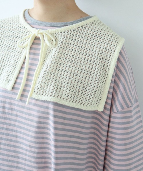 PAR ICIにありそうでなかった、編地がかわいいニット素材の付け襟。 糸の周りにカールしたループがついたループヤーン糸を、ざっくりとしたメッシュ状に編み立てることでふくらみのある軽やかな生地に仕上げました。どこか遊び心を感じさせるふわふわとした印象の糸ですが、程良くシャリ感があり通気性に優れているので、暑い時期にもレイヤードしていただきやすい付け心地です。 セーラーカラーのような雰囲気漂うスクエアシルエットの付け襟は、大きすぎない絶妙なサイズ感になるよう微調整を重ねました。存在感のある太めのパイピングや同素材のリボンのディテールを施し、女性らしいやわらかさの中にも程良くきちんとした印象です。可愛らしいアイテムに抵抗がある方にも取り入れていただきやすい、シンプルながらもちょっぴり甘さのあるアイテム。付け襟を主役にしたスタイリングはもちろん、着こなしにちょっぴり物足りなさを感じるときにプラスしても活躍します。 Tシャツとデニムのシンプルなスタイリングやワンピース等、いつもの着こなしに取り入れて華やかな印象に。シーズンレスでお使いいただけるので、秋口にはスウェットなどの中肉アイテムとの合わせもおすすめ。同素材でリボンベスト(5001KN006252)もご用意しております。 -------------------- 透け感:あり 伸縮性:あり 光沢感:なし -------------------- 【素材の特性・お取り扱いの注意】 ・取り扱いの注意については取り扱い表示をよくご確認の上、着用をお願い致します。 ・編み方により引っ掛かりやすいので、着用・着脱時にはアクセサリー等に十分ご注意下さい。 ・水洗いの際は型くずれを防ぐ為、平干しして下さい。 ・(ネイビー)素材の特性上、汗や雨等で濡れた時や強く摩擦が生じた場合に色落ちし、他の衣料に移染する事があります。白や淡色の衣類、インナー、バッグ等をご使用の際はご注意下さい。 ・(ホワイト×ネイビー)単独洗いでも水洗いする事により、淡色部分に色移りする可能性がありますので濡れたまま放置しないようにご注意下さい。 ※撮影画像は、光の当たり具合やモニターの環境により色味が違って見える場合があります。あらかじめご了承下さい。 ※画像はサンプルです。お届けする実際の商品と仕様、加工、サイズが若干異なる場合があります。 ホワイト×ネイビーのサンプルの画像から襟ぐりの横幅が1cm詰まります。リボンの長さが全長で3cm長くなります。 ホワイト×ネイビーとネイビーのサンプルの画像から、ブランドネームが小さく目立ちにくいものになります。