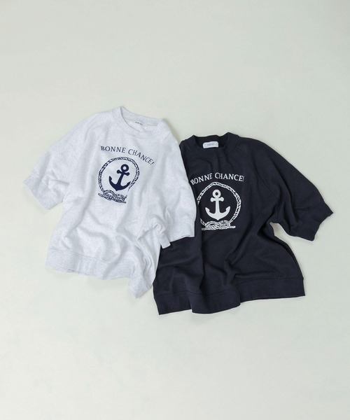 PAR ICIらしい、マリンテイストのロゴが主役の裏毛Tシャツ。肌離れする程良い肉感のミニ裏毛素材を使用し、暑い夏にも着ていただきやすい一枚です。ゆとりのある身幅や肘が見えにくい5分袖で、ボディラインを拾いにくいデザイン。ラグラン袖でカジュアルな雰囲気でありながらも、落ち着いた印象の杢ホワイトとネイビーのベーシックカラー展開で、様々な年代の方に着ていただきやすいアイテムを目指しました。縫い上がった製品を一度洗いにかける製品水洗い加工を加えているので、味のある風合いに仕上がっています。ご家庭での洗濯後に縮みが起きにくいのも嬉しいポイント。ブランドらしいオリジナル図案のいかりモチーフと、フランス語で“幸運を!”という意味の“BONNE CHANCE!”のフレーズは、大きさや配置部分など微調整を重ね、フロッキープリント加工で着る度に経年変化を楽しめる古着のような雰囲気に仕上げました。一枚で着映えするデザインの裏毛Tシャツは、デニムやチノパンツ等のベーシックな定番ボトムと合わせてもさまになります。軽めの素材の柄物ボトムとも相性抜群なので、夏から秋口にかけて様々なスタイリングで活躍します。--------------------透け感:なし裏地:なし伸縮性:ややあり光沢感:なしポケット:なし--------------------【素材の特性・お取り扱いの注意】・取り扱いの注意については取り扱い表示をよくご確認の上、着用をお願い致します。・フロッキー加工(生地表面に毛羽を付着させた加工)を施しています。強い摩擦が生じると表面の毛羽の脱落や他の製品に付着する事がありますので連続着用は避け、同色のお洋服やバッグ等との合わせをおすすめします。・裏返してネットに入れてお洗濯して下さい。シワになった場合はスチームアイロンを軽く浮かしながら掛けて下さい。・素材の特性上、年月の経過と共に毛羽が脱落します。・(ネイビー)汗や雨等で濡れた場合、摩擦により色落ちし、他の衣料に移染する事がありますのでご注意下さい。※撮影画像は、光の当たり具合やモニターの環境により色味が違って見える場合があります。あらかじめご了承下さい。※ネイビーとホワイトの画像はサンプルです。お届けする実際の商品と仕様、加工、サイズが若干異なる場合があります。ホワイトのサンプル画像から身幅が3cm狭くなります。正しいサイズ感はネイビーの画像をご覧下さい。