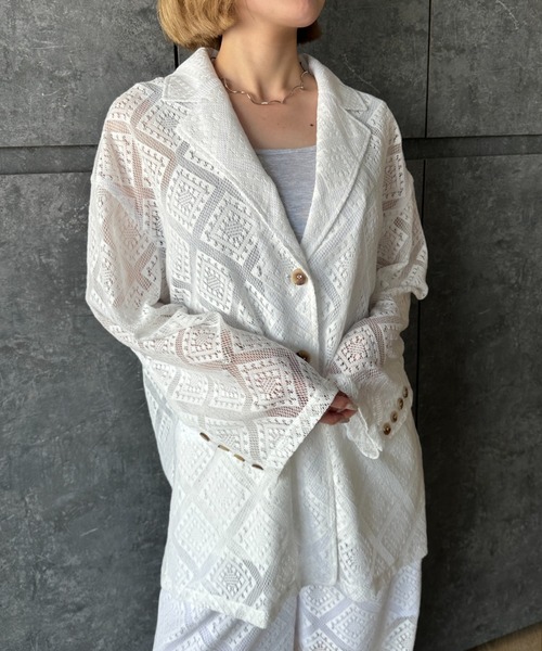 loose over lace jacket/ルーズオーバーレースジャケット夏にぴったりなレース素材を使用したテーラードジャケット。抜け感と清涼感のあるデザインで気温のブレが多いこの時期に1枚持っておきたい羽織りアイテムになります。------------------------透け感/あり光沢感/なし伸縮性/なし裏 地/なし厚 み/薄め------------------------<brand concept>トレンドやライフスタイルに都会的エッセンスを加え、ディティールにこだわり抜いたモードカジュアルスタイルを提案。▼商品のお気に入り登録完売カラーの再入荷通知や、ラスト1点、セールの通知をお知らせ致します。▼ブランドお気に入り登録新商品や再入荷など、いち早くブランドの情報を受け取ることができます。