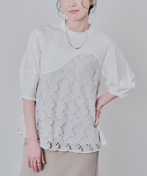 -25SS|DOLLUPOOPS-【Material】花柄のレース素材にカットソーを合わせたブラウス。上品さがありながらも、きれいすぎない抜け感もある生地感です。【Design】フロントにアシンメトリー調にデザインされたトップス。レースとカットソーの合わせがコントラストとなり良いギャップを生みます。【Size】全体的にゆとりのあるサイジング。アームにはパターンを入れ立体感を出しています。【Styling point】サラッとした肌当たりで、夏場でも快適に着用いただけます。綺麗目にまとめ、スラックスやスカートスタイルなどがおすすめです。___________________________★商品のお気に入り登録 完売カラーの再入荷通知や、ラスト1点の通知、セールの通知も受け取ることができます。是非ブランドのお気に入り登録もご一緒にお願い致します!!! ※画像の商品は光の反射や角度により、実物と色味が異なる場合がございます。 また、表示のサイズ感と実物は若干異なる場合もございますので、予めご了承ください。 ※着用、お取り扱いの際は、商品についている品質表示とアテンションタグを必ずご確認ください。-DOLLUPOOPS | ドールアップウップス-【Add a little essence】ライフスタイルの多様化が進む現代変わり続ける今をとらえ、自分らしい感性を大切にする女性に向けて" より美しく" 毎日を" 彩る" ワードローブを。日常に調和しつつ、" 普通 " に少しだけエッセンスをたして、他にない特別な一品を提案します。-Instagram-公式インスタグラム【dollupoops.tevalt_official】※商品のサイズ感やご質問は【dollupoops.tevalt_official】のインスタアカウントDMにて承っております。お気軽にご相談くださいませ。