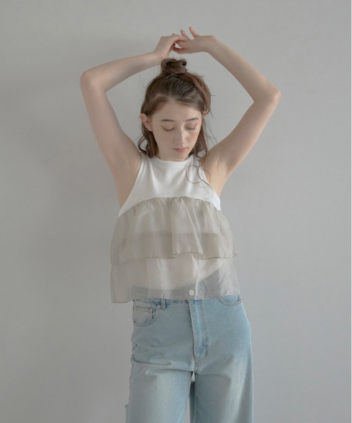 動きと軽さを纏う、オーガンジーフリルのタンクトップ リブタンクに光沢感のあるオーガンジーをドッキングしたニュアンストップス。 2段のティアードが立体感と華やかさを演出。 前後どちらにもフリルを施すことで、どの角度から見ても印象的。 アメスリ型の肩まわりがヘルシーな肌見せを叶えます。 タンクは伸縮性のあるリブ素材で、心地よく体にフィットする1枚です。 ------------------------ 透け感/ホワイトややあり 光沢感/オーガンジーあり 伸縮性/あり 裏地/なし 厚み/普通 ------------------------ ※着用中の摩擦や、汗、水濡れにご注意ください。濃色品は、色落ちや他のものへ色移りすることがあります。 ※異素材を組合せた商品は、洗濯を繰り返すことで形態変化(ねじれ、たるみ、つれなど)がおこる場合があります。 【必ずご確認の上、ご検討ください】 ※商品画像は撮影時の光や角度、お使いの照明やモニター環境により実物の色味と異なって見える場合がございます。 ※サイト上のカラー・サイズ表記と商品タグのカラー名・サイズ名が異なる場合がございます。 ※着用、お取り扱いの際は商品についておりますアテンションタグ、洗濯ネームを必ずご確認ください。 ※生産時期により、色・素材・サイズ感など多少異なる場合がございます。 ※商品によっては、繊維や染料のにおいが感じられる場合がございます。 数日のご使用や陰干しなどで匂いはほとんど感じられなくなりますのでお試しください。 ※通販の特性上、到着時には畳みシワがついている場合がございます。 【Information】 ◆《お気に入り登録》がオススメ◆ ・「商品のお気に入り登録」で再入荷通知や、ラストの通知、セール通知も受け取ることが出来ます。 ・「ブランドのお気に入り登録」で新商品や再入荷など、お得な情報を受け取ることが出来ます。
