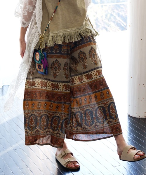 Inspired by the Indian Sariインドの魅力が日常を彩る………………………………………………さらりとした肌ざわりの良いレーヨンクレープ生地で、涼やかに過ごせるワイドパンツ。インドの伝統的な日常着、サリーの生地からテキスタイルをリデザイン。エスニックな柄とアースカラーでまとめたカラーリングで、普段のコーディネートのスパイスに◎・両サイドポケット付き。・裏地付き。・ウエストゴム紐仕様 MAX~106cm※こちらの商品は1点1点職人による手作りとなります。その為、生地の取り方により柄の配置や形・色合いなど若干異なる場合がございます。あらかじめご了承ください。※屋外での撮影画像は、光の当たり具合で色味・カラーが違って見える場合がございます。商品のカラーは、スタジオ撮影の画像をご参照ください。Amina Collection Co.,LTD.