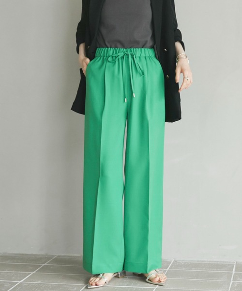 夏に映える!カラーが新鮮なパンツ 【point】 ・スタイリングの鮮度がアップする主役カラーの3色展開 ・センタープレスでラクだけどきちんと見えするパンツ ・程よいゆとりのあるシルエット ・ウエストは総ゴムで調整できるドロスト仕様 ・ヒールやスニーカーなどシューズの合わせで雰囲気を変えて様々なシーンに活躍します 【fabric】 ・さらっとした軽い肌触り ・シワが気になりにくい素材です 透け感:なし 裏地:なし 伸縮性:なし 光沢感:若干あり 生地の厚さ:普通 ********************** 【スタッフ着用コメント】 身長:156cm/体型:普通/普段サイズ:M/着用サイズ:36 サイズ感:ウエストはゴムなのでラクな履き心地です。着丈は裾がたるむ感じもなく短すぎずちょうど良く着られました。ゴムなので合わせるシューズによってウエスト位置をずらして履けるのがいいなと思いました。ゆるっと履くなら38サイズでもよさそうです。 素材感:さらっとしていて肌離れが良くきちんと見えするのに夏も涼しくはける生地感です。 着心地:ヒップ周りもぴったりしすぎず、足回りもゆとりがあり履きやすいです。センタープレスなのですっきり見えるのも大人にうれしいポイントだなと思います。カジュアル過ぎずにはけるカラーパンツは珍しいので着回しが楽しめそうです! ********************** 【注意事項】 ・画像の商品はサンプルです。 実際の商品と仕様、加工が若干異なる場合があります。 ・サイズ表記はあくまで目安となります。 ・取り扱いについては、商品についている品質表示でご確認ください。 ・照明の関係により、実際より明るく見える場合がございます。またパソコンなどの環境により、製品と画像のカラーが若干異なる場合がございますので、予めご了承くださいませ。 ■お気に入り登録がオススメです!■ 《商品のお気に入り登録》 カラー・サイズ選択の横の「♡」をクリックで簡単に登録できます 完売カラーの再入荷や在庫が1点になったとき、セールになったときに通知をお届けします 《ブランドのお気に入り登録》 ページ上部のブランド名の「♡ お気に入りブランドに追加」をクリックで簡単に登録できます 新商品の情報やイベントなどお得な情報をいち早くお届けします 是非、ご登録お願いします♪