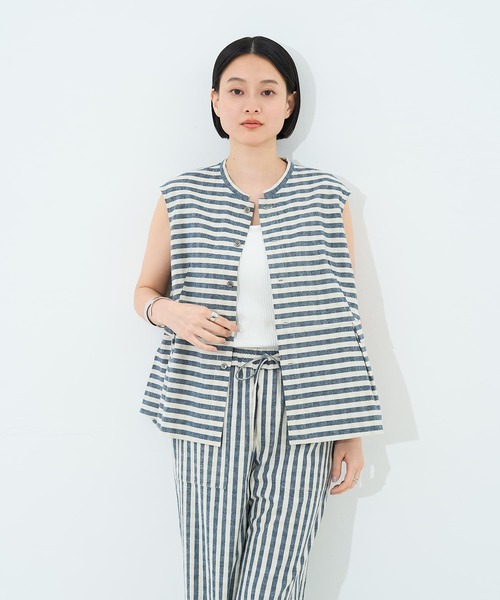 暑い夏に清涼感を演出、ストライプブラウス《POINT》夏らしいコットンリネンのノースリーブブラウス。ボーダー柄プラスうっすらと入った縦ラインでさり気なくチェック見えする清涼感のある生地です。裾に向かって広がるシルエットと後ろ身頃に向かってフレアを出し、360度ぐるりと絵になるデザイン◎スリーブレスですが、肩先に少しかかる絶妙な袖丈です。テーパードパンツ、ワイドパンツなどシルエット選ばす合わせていただけます。サロペットやノースリーブにジレ風に羽織るものオススメです。同素材のパンツとセットアップでも着用可能。