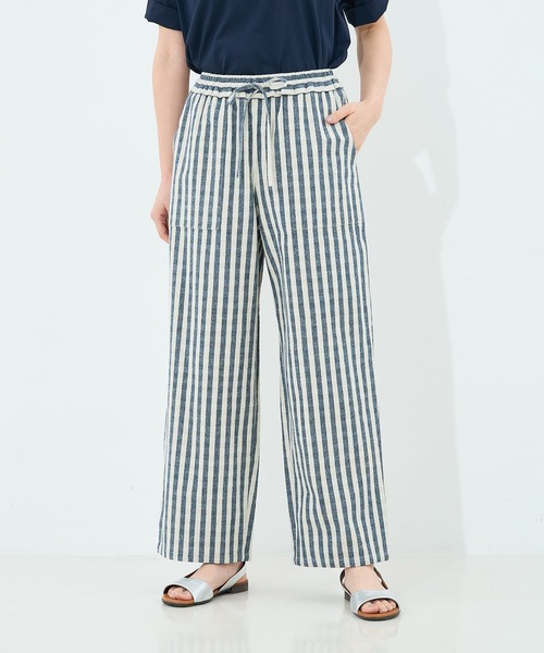 大人の夏のイージーパンツ《POINT》夏らしいコットンリネンのリラックス感のあるパンツです。ストライプ柄プラスうっすらと入った横ラインでさり気なくチェック見えする清涼感のある生地に。ウエストはゴムと共地生地の紐を通したイージーパンツ。全体的にゆったりとしたシルエットで、裾に向かって少しテーパードしています。Tシャツや、シャツ・ブラウス、リネンジャケットなどとの合わせがオススメ。小柄な方は裾をロールアップして着てもリラックス感があって素敵です。同素材のブラウスをセットアップでも着用可能。