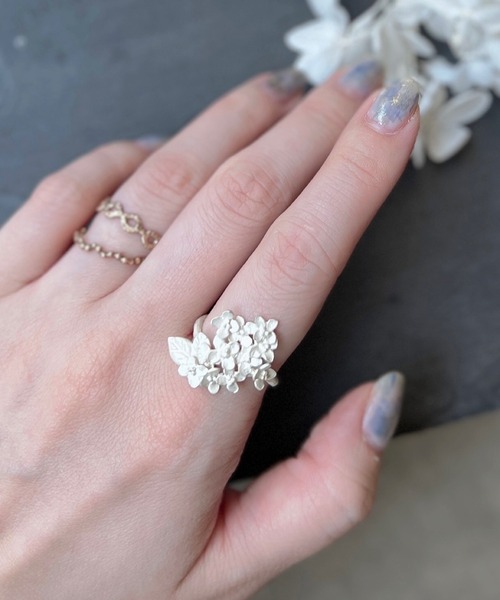・*:・ アジサイシリーズ・:*・ 細かな花が集まったアジサイを そのまま形にしたメタルのアジサイシリーズ。 小さなお花をいくつも重ね合わせて、 奥行きのあるデザインに。 使うことで色味が変化し、 より立体感のあるアイテムに変化していきます。 リングは、存在感がありながらも 指に馴染むように平らなアジサイに。 フリーサイズで、調整したサイズによって印象が変わるので ご自分だけのアクセサリーとしてお楽しみください。 アジサイのシリーズ ピアス / イヤリング / リング 【m.soeur(エムスール)*】 m.soeur(エムスール)は京都発のハンドメイドアクセサリーブランドです。 植物の美しさや生命力を表現しつつもお洋服に寄り添うような、ナチュラルでクラシカルなアイテムを 制作しています。 一点一点人の手で作り上げられる手作りのアイテムは温かみがあり、使い込むごとに味わいをましていきます。 ・*:・ ・:*・ ・*:・:*:・:*・ 【注意事項】 ※手作業のため、画像の商品と色、形、大きさが多少異なる場合がございますので、予め御了承下さい。 ※変色する場合がございますので水や雨等には十分ご注意下さい。 ※真鍮やシルバー(ホワイト加工)の素材は、時間がたつにつれ、深く味わいのある色に変化していきます。お色味の変化も是非お楽しみください。