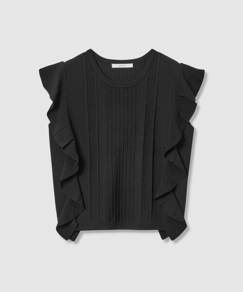 レーシーなリボンの様に、メッシュ柄を編み込んだニット素材。 肌触りがサラリとした、ややひんやり感を感じられるレーヨン混素材でこれからの時期に活躍する手洗いも可能な素材です。 ラッフルとピンタックのデザインディテールでブラウスの様に着て頂きたいプルオーバーです。 肩先に施した揺れるラッフルは、身頃のサイドにアクセントを付けつつ、スリーブレスながら穏やかに肩先を覆います。上にジャケットを羽織ってもスッキリとおさまります。 ジャケットの首元にも縦の柄がアクセントになるので、インナーとしてもお勧め。 暑い時期に1枚で着映えるフェミニンニットです。 【付属】なし 【裏地】なし 【透け感】ややあり 【開き・留め仕様】なし 【伸縮性】あり 【ケア方法】手洗い可 【着用感・生地の厚さ】程よい肉感で体のラインをひろいません ホワイト着用 model:178cm 着用サイズ:38 ピンク着用 model:171cm 着用サイズ:38 ブルー着用 model:173cm 着用サイズ:38 【ANAYIサイズ表】 34サイズ:5号 XSサイズ相当 36サイズ:7号 Sサイズ相当 38サイズ:9号 Mサイズ相当 ・「商品のお気に入り登録」や「ブランドのお気に入り登録」で新商品や再入荷通知、セール通知などのお得な情報を受け取ることができます。 ・照明の関係により、実際よりも色味が違って見える場合がございます。 またパソコン・スマートフォンなどの環境により、製品と画像のカラーが異なる場合もございます。予めご了承ください。