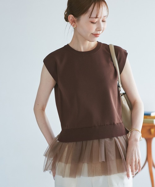 フェイクレイヤードで手軽におしゃれな着こなしが叶う!【素材感】・シャリみのある肌離れがよく、夏にもおすすめの糸を使用。【デザイン・シルエット】・ペプラムシルエットのチュール使いニット。・ゼロスリーブくらいの肩幅で肩先の骨が隠れるので露出感が低く、安心の着用感。・裾からボリューミーな、チュールのティアードが覗くデザイン。・中肉の厚さなので、下着が透けにくい。【カラー】・ブラック、キナリ、ブラウンの3食展開。【スタイリングポイント】・パンツを合わせてすっきりと着るのがおすすめ。・ナロースカートに合わせた大人な着こなしも素敵。 ・ロングペンダントなどでアクセントを加えても◎。-----------------------------裏地:なし透け感:あり伸縮性:ややあり生地感・厚さ:やや薄手ポケット:なし季節:夏-----------------------------※撮影時の光、お使いのモニター環境によって色の見え方が違う場合がございます。【モデル着用サイズ】身長:165cm 着用サイズ:F