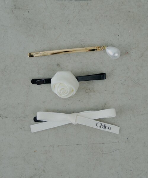 いつものヘアスタイルに上品なアクセントをプラスしてくれるヘアピンセット登場! ▶商品ポイント ・控えめながらも存在感のあるバラモチーフのヘアピンは、大人可愛いアクセントに。 甘すぎないデザインで、幅広いスタイリングにマッチします。 ・清楚なパールのヘアピンは、上品でフェミニンな印象に。 ・リボンのヘアピンには、さりげなくブランドロゴが入りワンポイントアクセントに。 ・その日の気分やファッションに合わせて、自由にアレンジを楽しめます! -------------------------------------------- ▼お気に入り登録のおすすめ▼ ハートをクリックしてお気に入りに登録すると 完売カラーの再入荷や残り1点の通知、セールの通知を受けとることができます。 ▼ブランドのお気に入り登録▼ 新商品や再入荷、セール通知やショップのおすすめトピックスなど、いち早くブランドの情報を受け取ることができます。 ▼メルマガ登録▼ Chicoのお得な情報やニュースを一足先にお届けします。 -------------------------------------------- ※商品について ・サイト上のカラー名と、お届け商品に記載されているカラー名が異なる場合がございます。 ・商品の色味は、撮影場所や光のあたり具合などにより色味が違って見える場合がございます 。 また、お客様のお使いのPCのモニター環境などにより色味が違って見える場合がございます。 予めご了承の上ご注文下さい。 ・セールは予告なく終了させていただく場合もございます。 ※商品ページでは、遅延などの影響も考え、お届け予定時期を少し先に設定させていただいております。 予約商品は商品ページに記載しているお届け予定時期よりも早いお届け予定になる場合がございますので、予めご了承ください。 ※返品・キャンセルについて ・着用、洗濯後の返品、交換は致しかねます。 ・商品到着後、着用前に商品を確認して頂きますようお願い致します。 ※画像の商品はサンプルです。実際の商品と仕様、加工、サイズ、素材が若干異なる場合がございます。 ※ご注文いただいた予約商品のお届け時期の確認は、注文履歴ページより行えます。