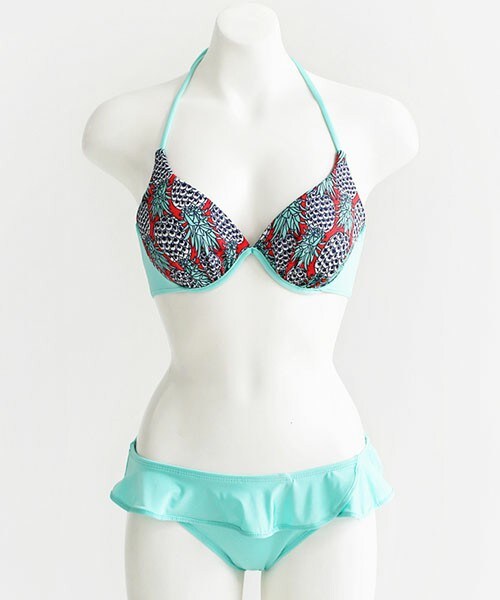 夏らしいユニークなパイナップル柄のワイヤービキニ☆体型が綺麗に見える配色デザイン! ショーツに付いたフリルでヒップラインも可愛らしく演出♡ ※WEARに記載してある金額と、DHOLIC通販サイトに記載してある金額にシステム都合上誤差がございますが、正しい金額はDHOLIC通販サイトの方です。