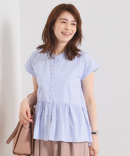【デザイン】 トレンド感あるペプラムブラウス。 パール調ボタンが大人可愛いアクセント。 今シーズンもトレンドのペプラムブラウス。 程よくハリ感のある素材を使用したふんわりシルエットで、一枚で華やかな印象にきまります。 ストライプ柄なのでカジュアルにも着まわし易く、ONからOFFまで幅広いシーンで活躍。 前後差丈のデザインで後ろが長めになっているので、気になる腰周りやヒップもさり気なくカバーできちゃう。 前開きデザインなので羽織としても使える着回し力あるアイテムです。 【素材】 適度なハリ感と柔らかさを兼ね備えたポリエステル・コットン素材のシャツ地です。 ※照明の関係により、実際よりも色味が違って見える場合があります。また、パソコン・スマートフォンなどの環境により、若干製品と画像のカラーが異なる場合もございます。 ---------------------------------------- ★お気に入り登録がおすすめ★ ▽気になる商品はハートマークをクリック! ・再入荷やセールの通知をお知らせ ・お気に入り一覧からいつでもチェック ▽ブランドのお気に入り登録も! ・新商品やお得な情報をいち早くお知らせ ---------------------------------------- モデル情報:身長165cm B82 W60 H88 着用サイズ:00(フリーサイズ) 店舗へのお問い合わせ商品番号:P93-52544 ●製品寸法: 00(フリーサイズ):着丈68cm B94cm 裄丈32cm 備考: