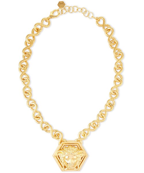 Versace yellow golden necklace.Twisted, engraved chain links.Signature Medusa logo pendant.Approx. 32"L.Lobster clasp.Made in Italy.