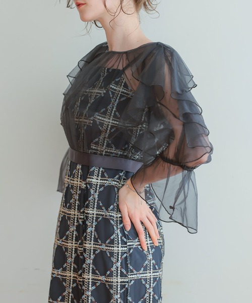 透け感とお袖が特徴のボレロ×動くたびに光り輝く上品なデザインのIラインドレス ユニークなデザインのフリルボレロに、 ワンピースにはチェック柄ときらきらと輝くモール糸を施し 華やかさと立体感を演出。 透け感のあるシアー素材を使用したフレアスリーブは、手元まで美しく華やかに。 バックスタイルのリボンが後ろ姿も抜かりなく女性らしさを演出してくれます。 ワンピースはアジャスター付きなので長さの調整もでき、バックスリットが入っているので 足さばきもよく歩きやすい一着です。 それぞれ単体で使用することができるので、レイヤードスタイルやジャケット合わせ等幅広いスタイルを楽しんでいただけます。 結婚式のおよばれや、卒業パーティーなど華やかなシーンにぴったりなドレスです。 ※商品画像は、光の当たり具合やパソコンなどの閲覧環境により、 実際の色味と異なって見える場合がございます。予めご了承ください。 【備考】 ・裏地あり ・伸縮性なし ・後ろ背中部分ゴム入り ・バックファスナー仕様 洗濯方法:クリーニング店にご相談ください。 ※その他お取り扱いに関しましては、商品に付属のアテンションタグをご覧ください。 ◼オススメシーン◼ 結婚式・2次会(二次会)・1.5次会・披露宴・お呼ばれ・成人式・同窓会・謝恩会・パーティー・演奏会・食事会まで、多様なシーンのコーディネートにご使用いただけます。 ◼商品のお気に入り登録 ◼ 完売カラーの再入荷通知や、ラスト1点の通知、セールの通知も受け取ることができます。 気になるアイテムは《お気に入り登録》が絶対オススメ! ◼ブランド紹介◼ Dress Shop " Dorry Doll"(ドリードール) 結婚式やパーティーなどのフォーマルシーンはもちろん、発表会、謝恩会、入学式や卒業式などのセレモニーシーン、そして女子会や食事会などのカジュアルシーンなど、多様なシーンにご使用いただけるドレススタイルをご提案させていただいております。 また、トータルコーディネートがきるよう、羽織や、パーティーバッグ、パーティーシューズ、アクセサリーなども豊富に揃えております。