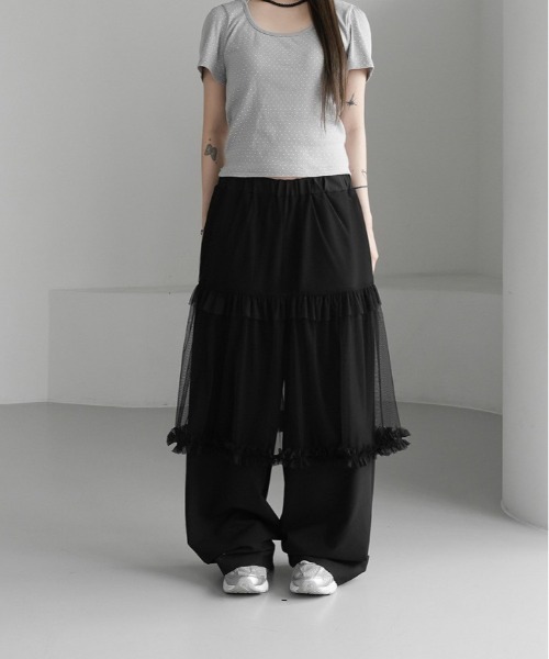 チュールスカートとのドッキングパンツ☆ フリフリのチュールがコーディネートを華やかに!細見え効果も抜群のワイドシルエットのパンツ。 個性的なデザインで、ショートトップスやカーディガンなど、シンプルスタイルでも可愛く決まります。 ※モニター・環境等により実際の商品と多少色味が異なって表示される場合がございます。あらかじめご了承ください。 ※海外輸入品のため、商品の入荷時期によって色合い、生地、デザイン等に若干の違いがございます。 商品の細部仕様は予告なく変更になる場合がございます。