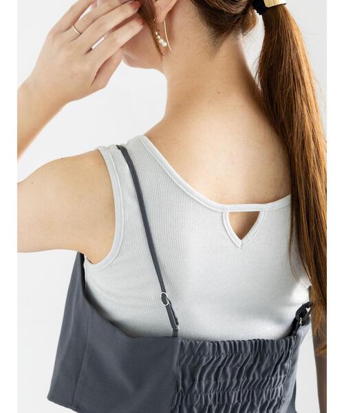 気分やコーデに合わせて前後どちらでも着用が楽しめる2WAYデザインのタンクトップ。伸縮性のあるテレコ生地を使用しており、動きやすく着心地も快適です。V開きのアクセントがインナーによく合います。1枚でシンプルに着るのはもちろん、旬のシアーアイテムとレイヤードしたりとさまざまな着こなしにも活躍してくれます。ワードローブの定番アイテムに是非取り入れたい1枚です。※商品画像は、撮影環境やお客様のご利用のPC・スマートフォンのモニター環境などにより実物と色味に差異がある場合がございます。